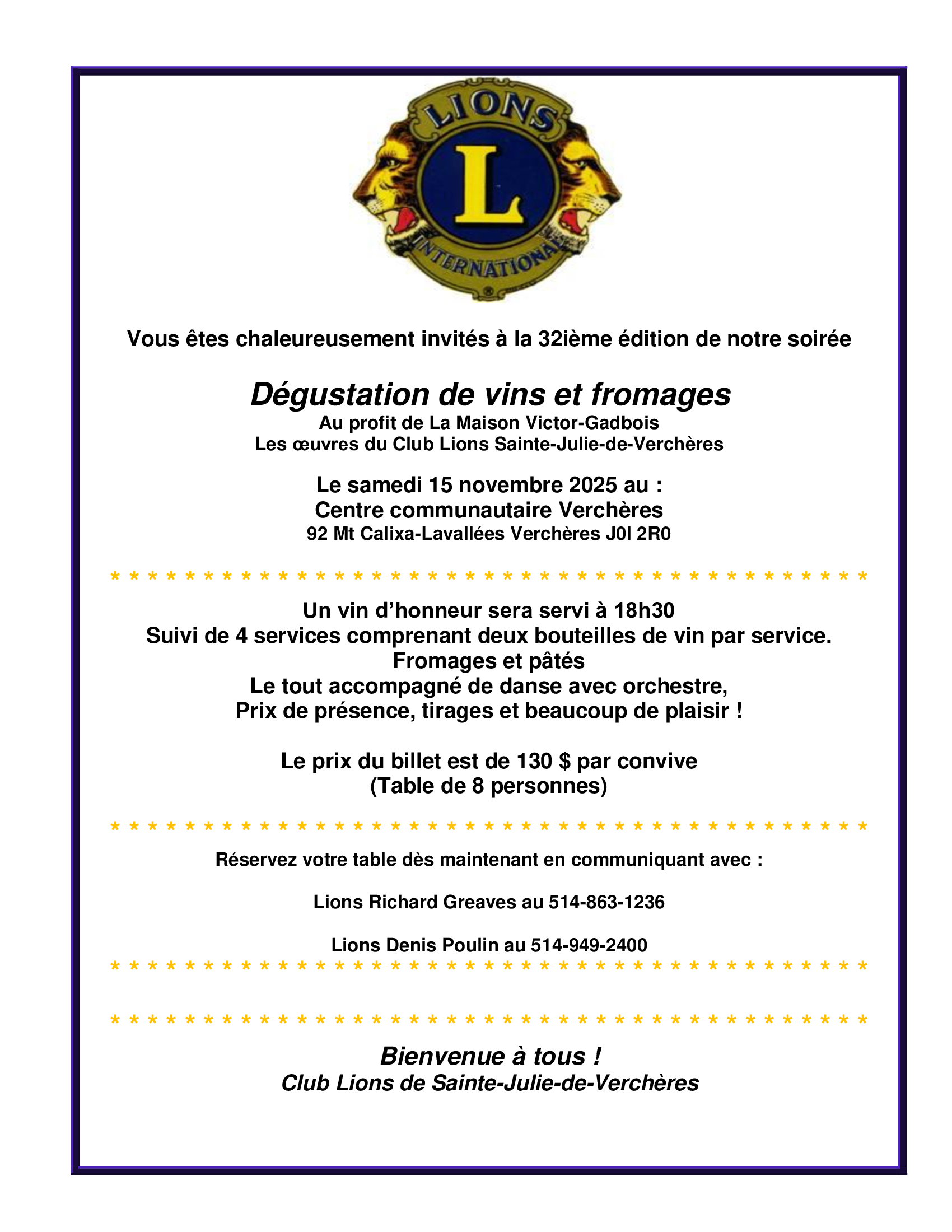 Dégustation de vins et fromages organisée par le Club Lions Sainte-Julie-de-Verchères Un vin d’honneur sera servi à 18h30 Suivi de 4 services comprenant deux bouteilles de vin par service. Fromages et pâtés Le tout accompagné de danse avec orchestre, Prix de présence, tirages et beaucoup de plaisir ! Réservez votre billet dès maintenant en communiquant avec : Lions Richard Greaves au 514-863-1236 Lions Denis Poulin au 514-949-2400